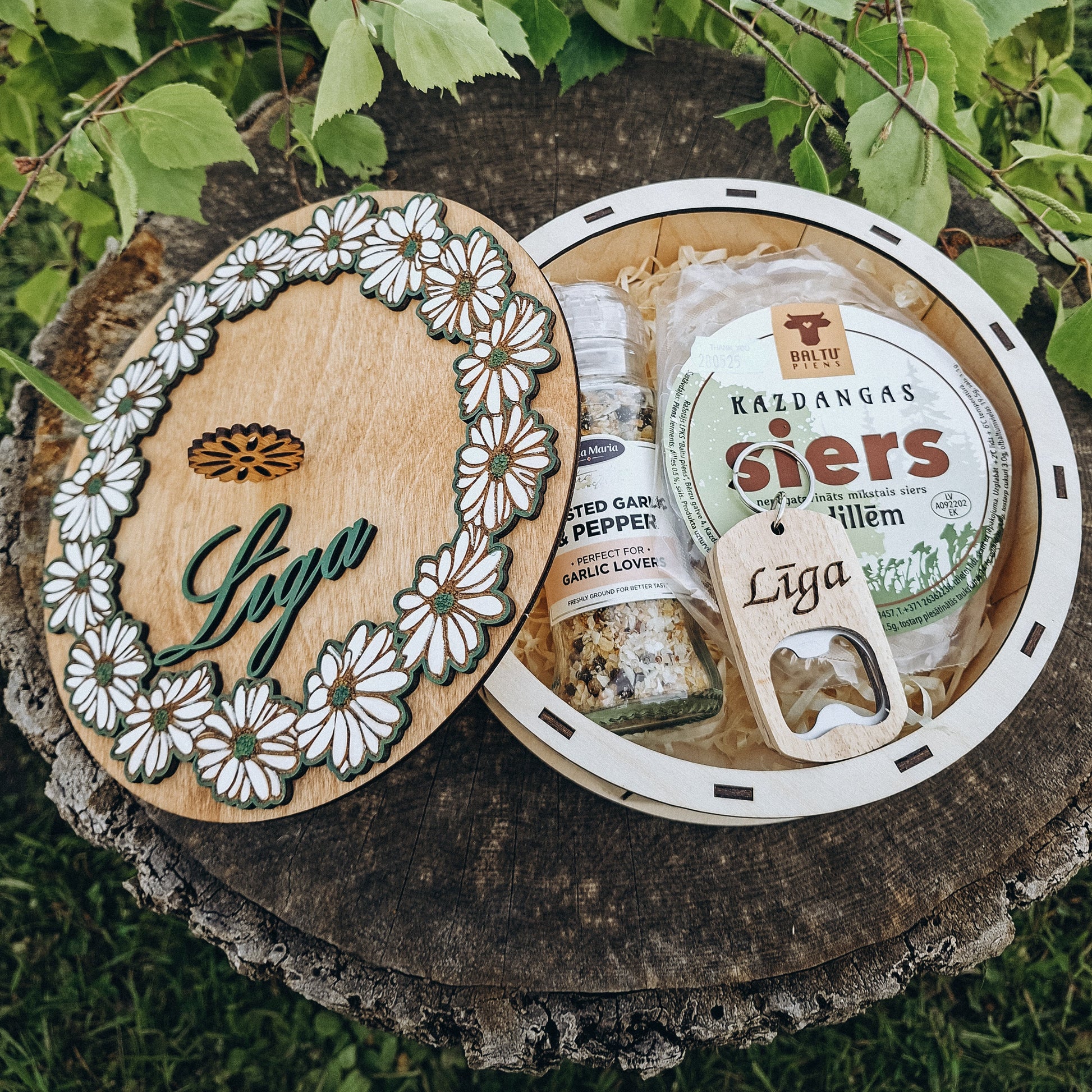 Svinēt svētkus skaisti un dabīgi! Šī apaļā koka dāvanu kaste ar margrietiņu vainagu ir radīta īpašiem mirkļiem – Līgas vārda dienai, vasaras saulgriežiem vai sirsnīgai dāvanai. Katras kastes vāks ir mūsu pašu rūpīgi krāsots, padarot katru izstrādājumu par unikālu roku darbu.